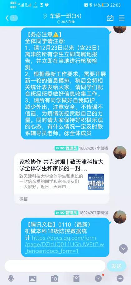 2022年伊始,“奥密克戎”突袭津城,对人民的生命健康安全带来了巨大威胁,摸清新冠肺炎感染者情况,遏制疫情蔓延刻不容缓。机械本科生车辆党支部号召支部全体成员以自身实际行动参与这场没有硝烟的战争,担负起新时代青年应尽的责任。