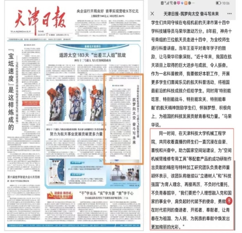 《天津日报》在2021年9月17号发表了“空间站首次载人飞行 天津科大科研团队助‘一臂之力’”的专题报道。中国《机械工程学报》和“学习强国”滨海新区学习平台也予以相关的报道,这不仅大大提升了团队人员的信心,同时也为全校师生在科研方面树立了榜样。2022年4月17号,在三位航天员翟志刚、王亚平、叶光富凯旋的日子,《天津日报》头版发表了“筑梦向太空 奋斗写未来”的报道,再次对天津欧美性爱免费在助力国家空间站建设中做出的贡献给予表彰。